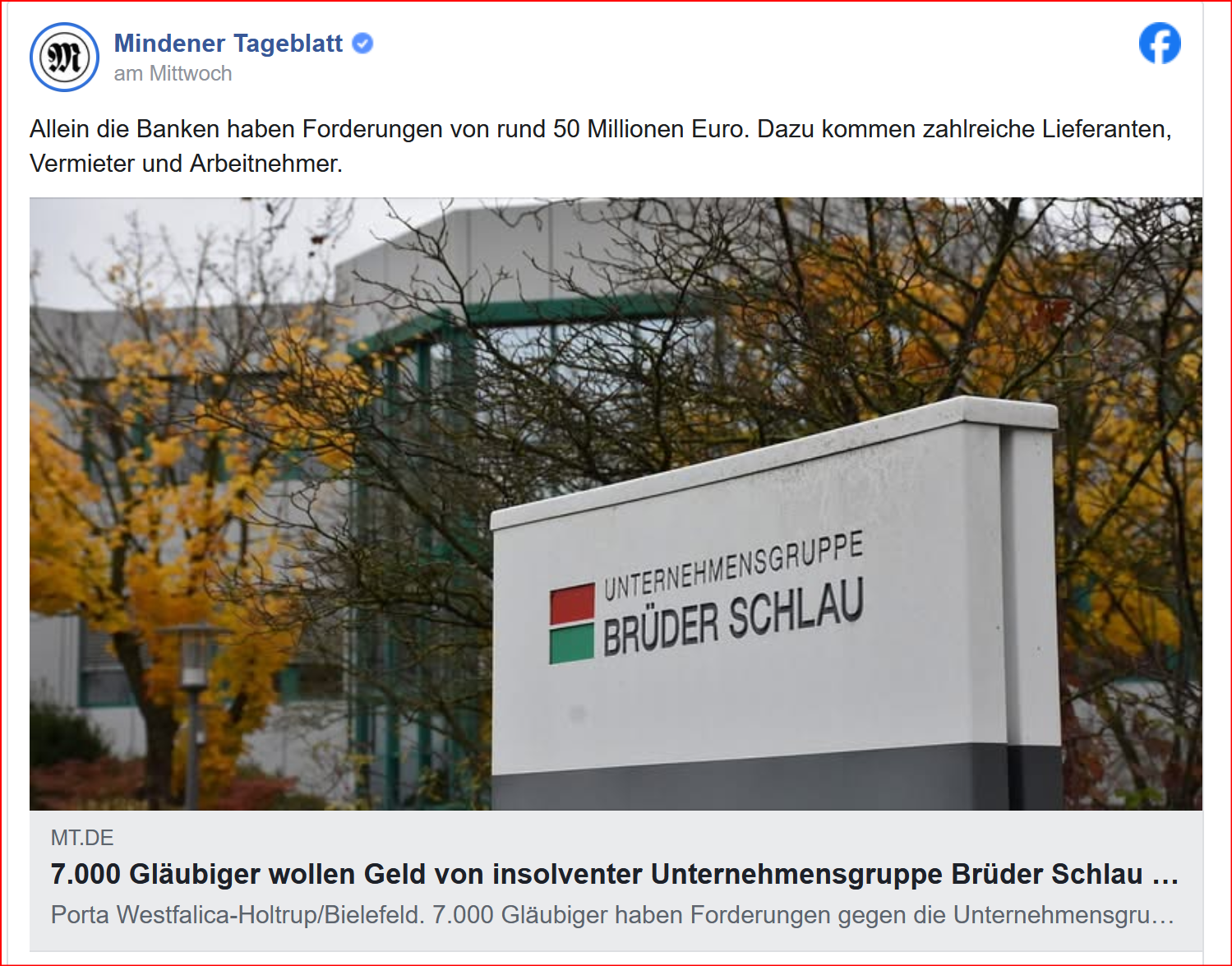 Die UnternehmensgruppeBrüder Schlau ist insolvent. Zu der Gruppe gehört die Fachmarktkette Hammer, deren Zukunft unsicher ist, da ein Teil der Märkte geschlossen oder verkauft werden soll. Die Schlau Großhandel-Märkte wurden bereits größtenteils geschlossen oder verkauft, da sie unter die Insolvenz fielen.