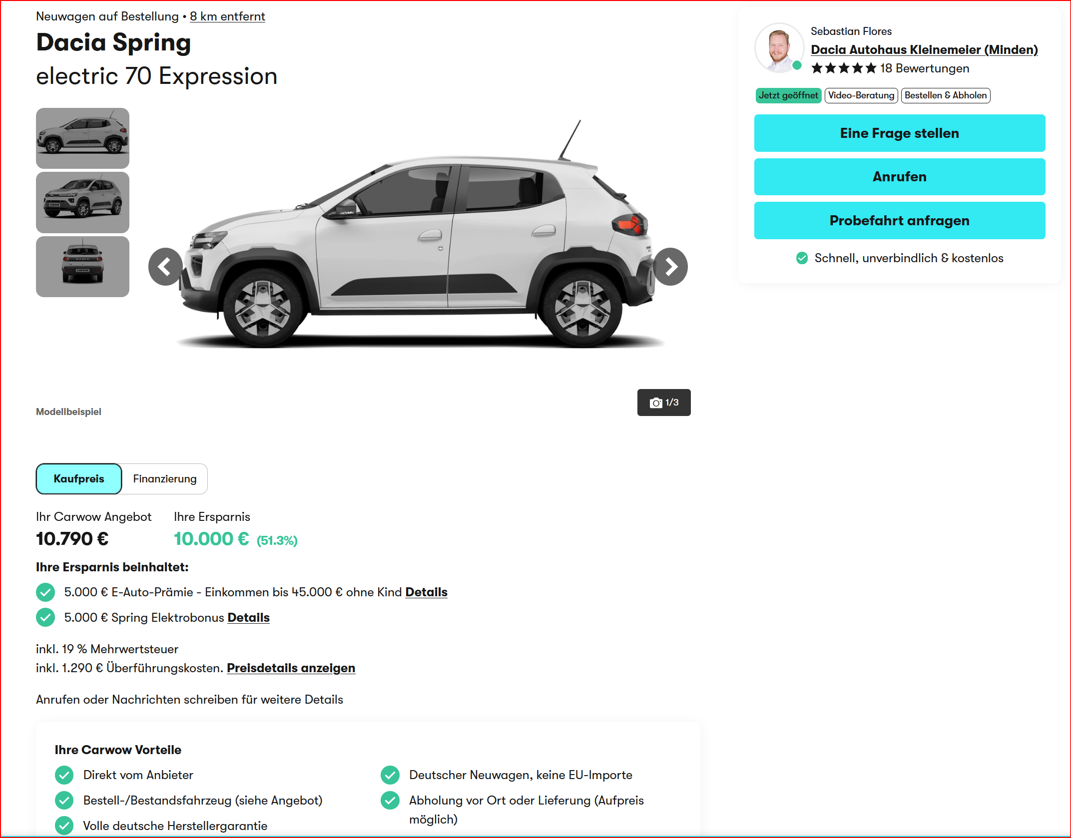 Wegen der Förderung wollte ich heute vormittag als Spassauto den Dacia Spring kaufen. Er hätte eigentlich auch gut zu meiner PV-Anlage gepasst.