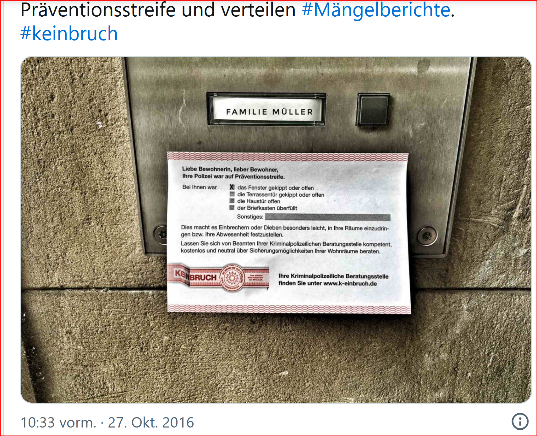 Die Polizei warnt vor überfüllten Briefkästen, kennzeichnet jedoch die Briefkästen abwesender Bewohner mittels spezieller Zettel, denen zu entnehmen ist, dass kein Bewohner zuhause ist.