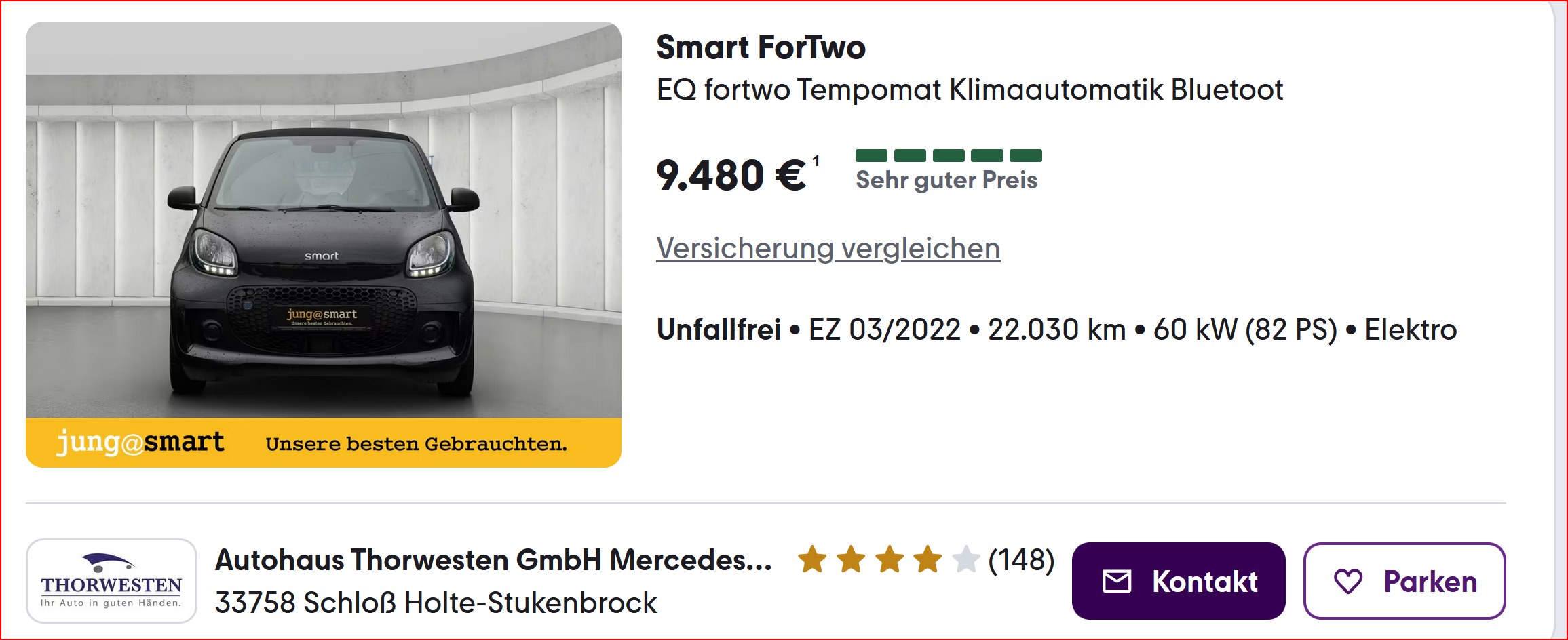 Der Smart EQ (Fortwo) ist einsehr empfehlenswerter, wendiger Stadtflitzer, ideal für Kurzstrecken und Parkplatznot, mit einer realen Reichweite von etwa 90–140 km. Besonders mit dem optionalen 22-kW-Lader lädt er in ca. 40 Minuten (10-80%) schnell auf. Er bietet spritzigen Fahrspaß, ist aber für Langstrecken ungeeignet.