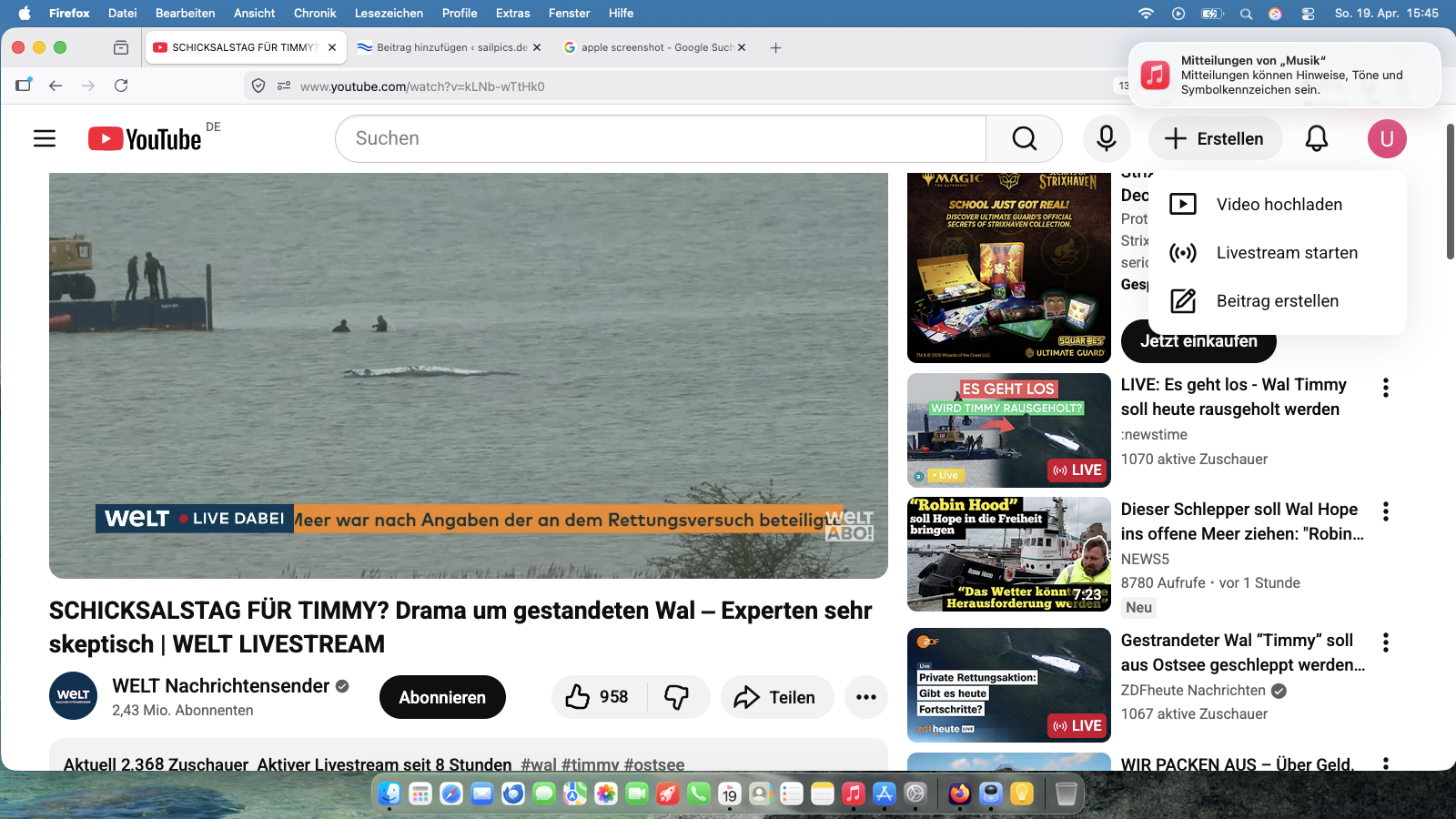 Statt mit höchstem Einsatz an Timmys Rettung zu arbeiten, sehen wir lediglich zwei Mann im Wasser und weitere zwei Personen, die sich an Bord des Bagger-Pontons die Füsse vertreten. Es fehlt offenbar ein Macher wie Herlmut Schmidt während der Hamburger Hochwasserkatastrophe, der die Führung übernimmt und die Rettung voranbringt. Soweit neuerdings eine Tierärztin involviert ist, die noch nie etwas mit Walen und deren Rettung zu tun hatte, sind erhebliche Zweifel angebracht