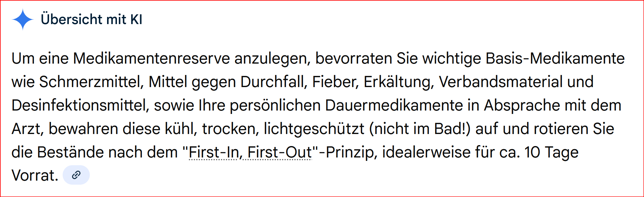 Ich habe mir daher privat eine Medikamenten-Reserve für ein Quartal verschreiben lassen. Auch wenn ich einmal vergessen habe, ein Dauermedikament nachzubestellen gerate ich nicht mehr so unter Druck.