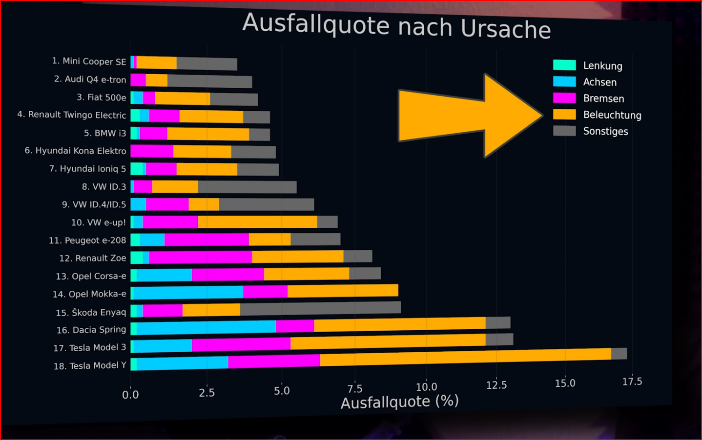 Der Dacia Spring scheint nicht so gut abzuschneiden. Der Tesla schneidet schlecht ab, da keine Inspektionen vorgeschrieben sind,