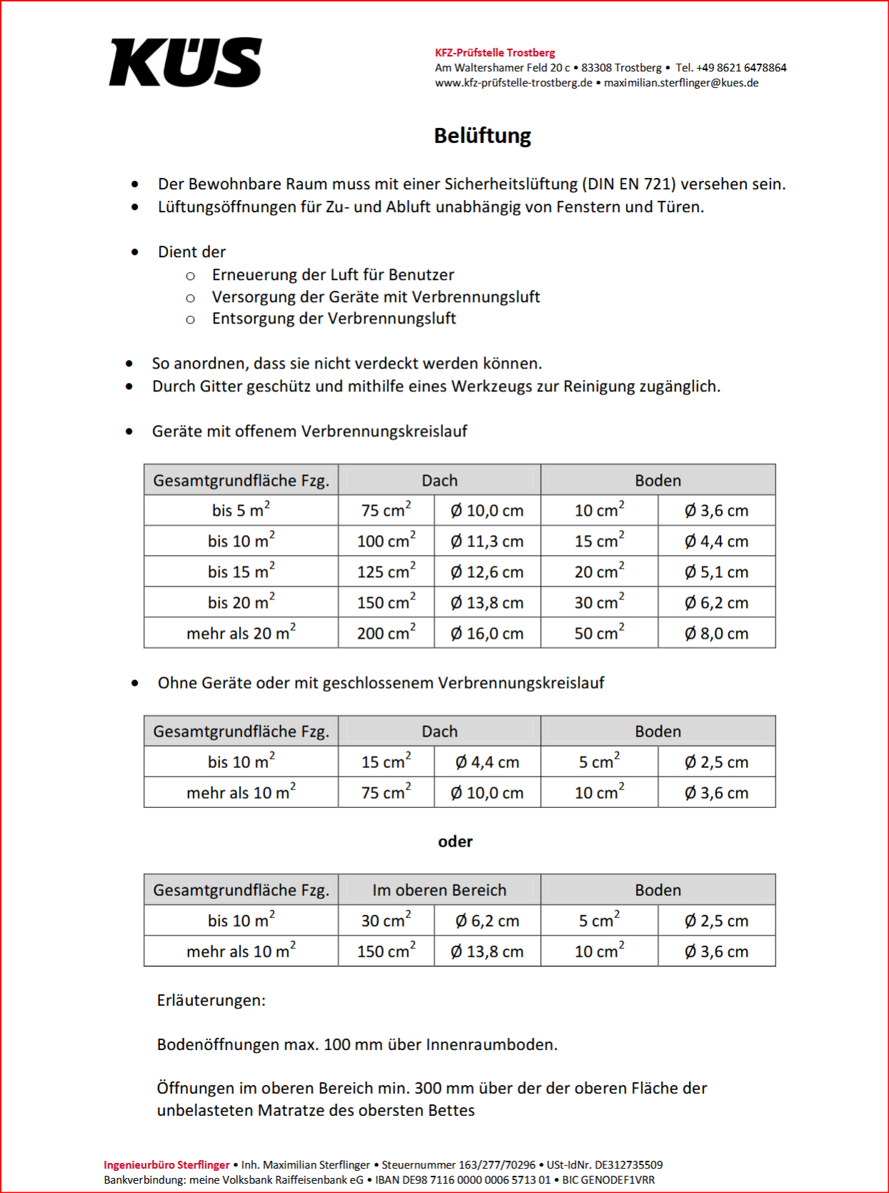 Wie gross die Belüftungsöffnungen im Dach und dem Boden sein müssen, habe ich dem folgenden Dokument entnommen: https://www.kfz-pruefstelle-trostberg.de/wordpress/wp-content/uploads/2023/07/Merkblatt-Wohnmobil.pdf